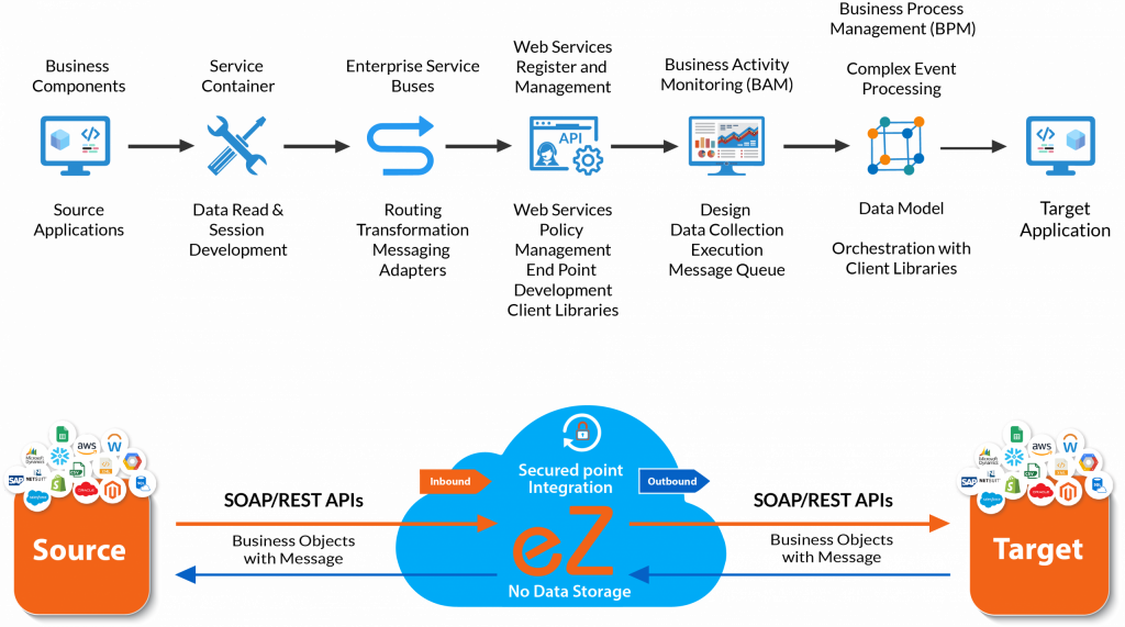eZintegrations™ facilitates effortless connections to a wide range of systems, including ERP, SCM, CRM, APIs, Data Lakes, and other enterprise systems.